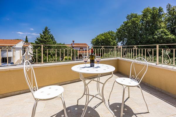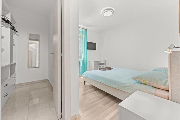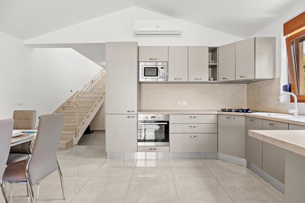 Elegantni interijer se sastoji od prizemlja s kuhinjom, dnevnim boravkom i jednom spavaćom sobom, dok su dvije spavaće sobe na 1. katu. Svaka soba ima svoju privatnu kupaonu. Extra wc u prizemlju. Kauč u dnevnom boravku može biti i krevet za dvije osobe.