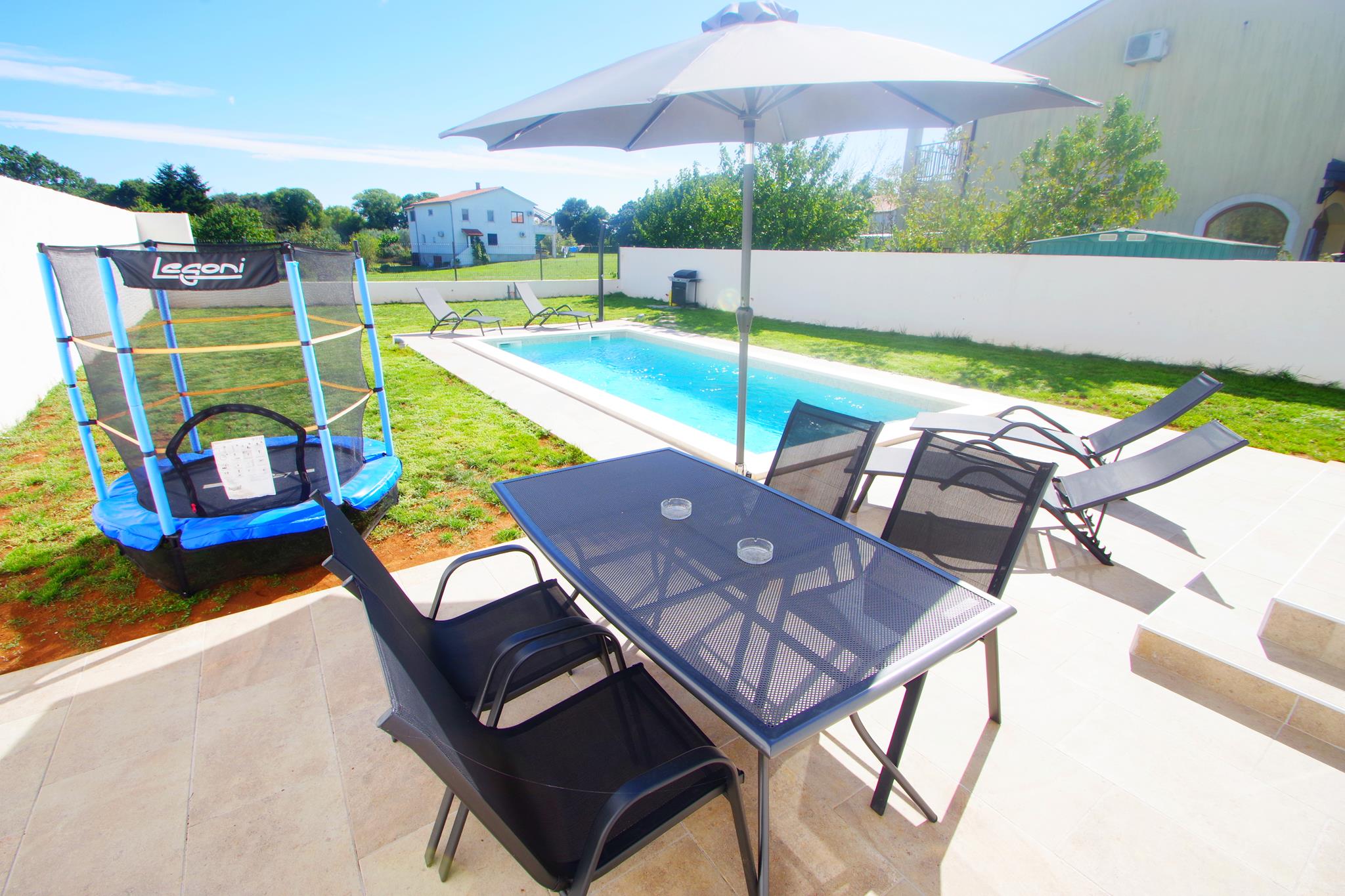 Outside: - 450m enclosed garden, private pool (7m x 3m), 4 sun beds and umbrella, outside shower, sitting furniture, grill ( on gas ), trampoline for kids, 2 private parking