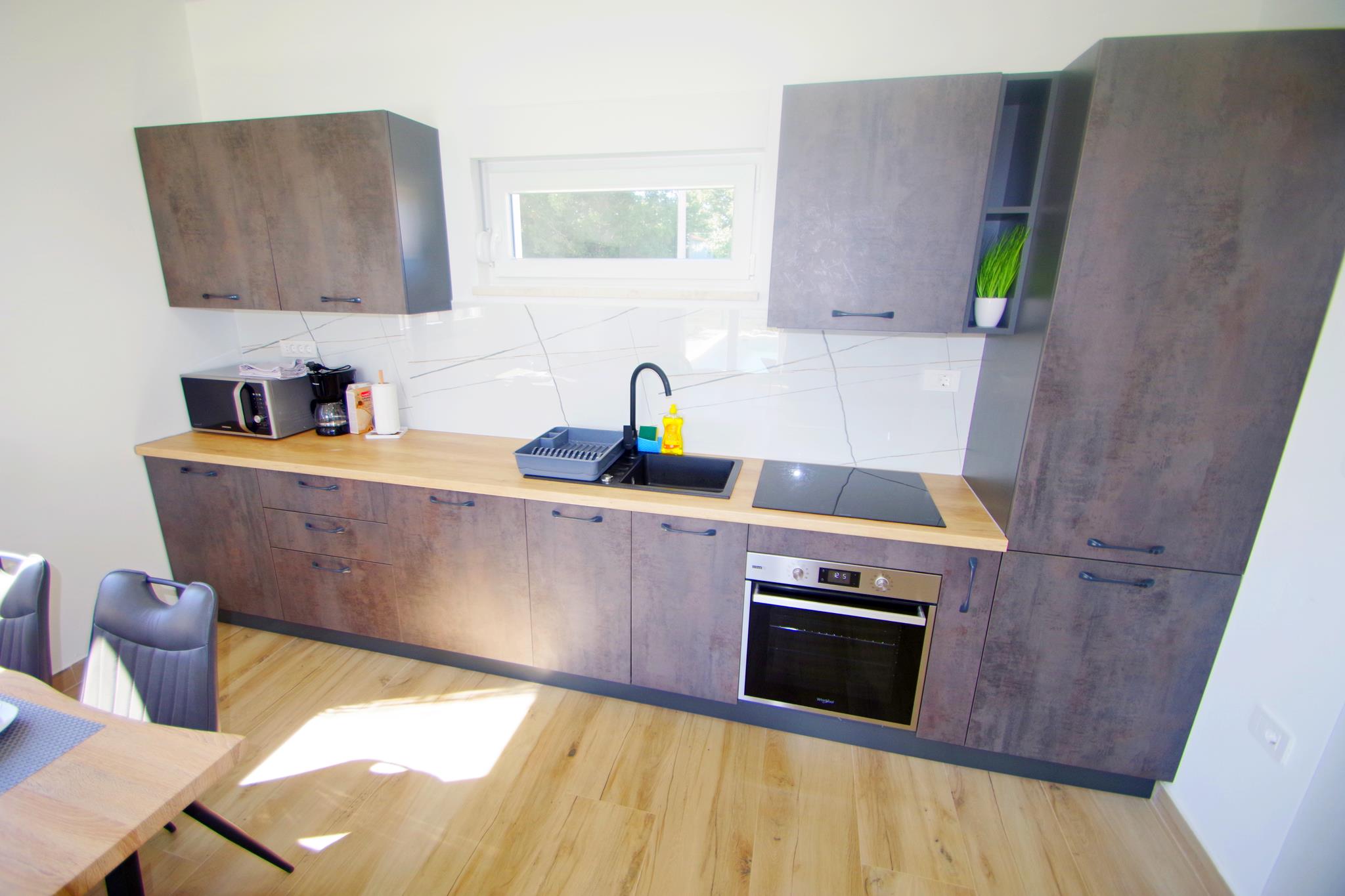 - kitchen ( induction stove with 4 cooking rings, refrigerator with freezing section, dish washer kettle, coffee machine (filter), oven, toaster, hood, utensils for cooking and eating, microwave )