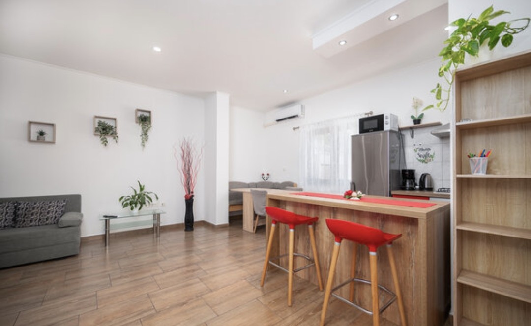 Unutarnja površina apartmana je 55 m2. Namješteno za potpunu udobnost stanovanja, nudi klima uređaj, privatni parking, posteljinu i ručnike, TV, dječji krevetić