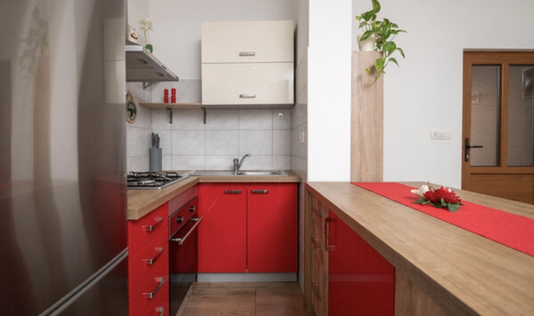 - kuhinja (plinski štednjak sa 4 ploče, hladnjak sa zamrzivačem, kuhalo za vodu, aparat za kavu (filter), pećnica, toster, napa, posuđe za kuhanje i jelo, mikrovalna pećnica)