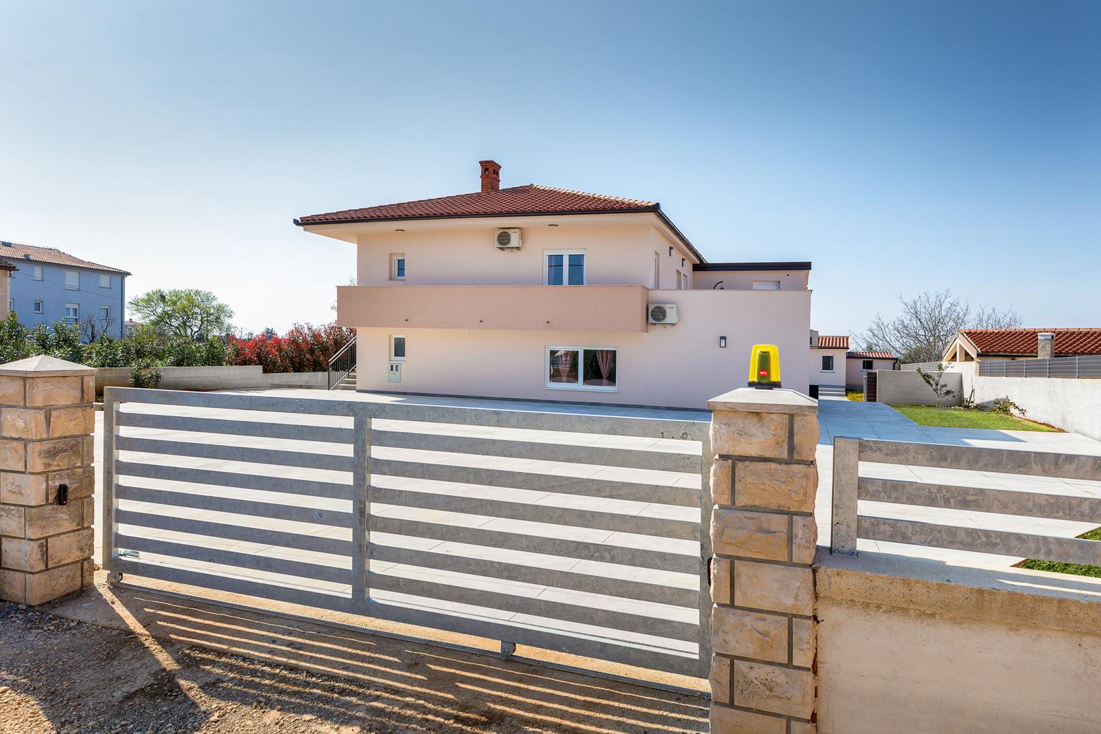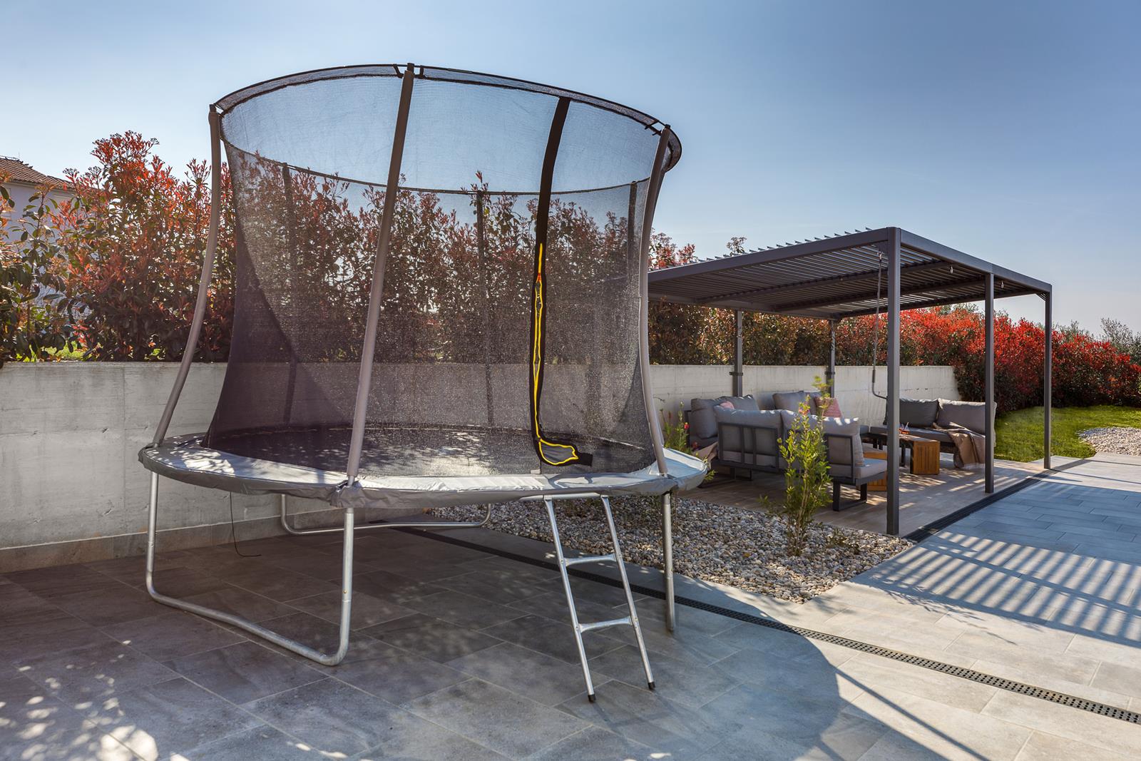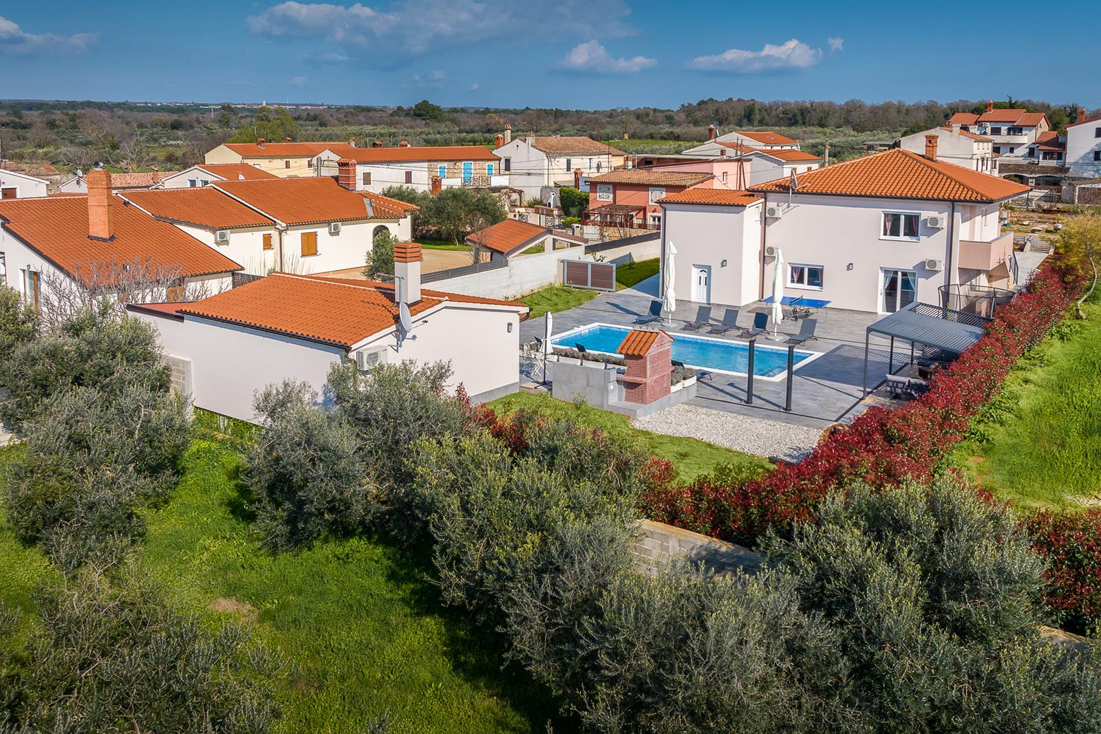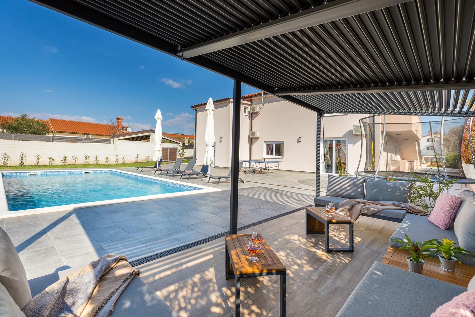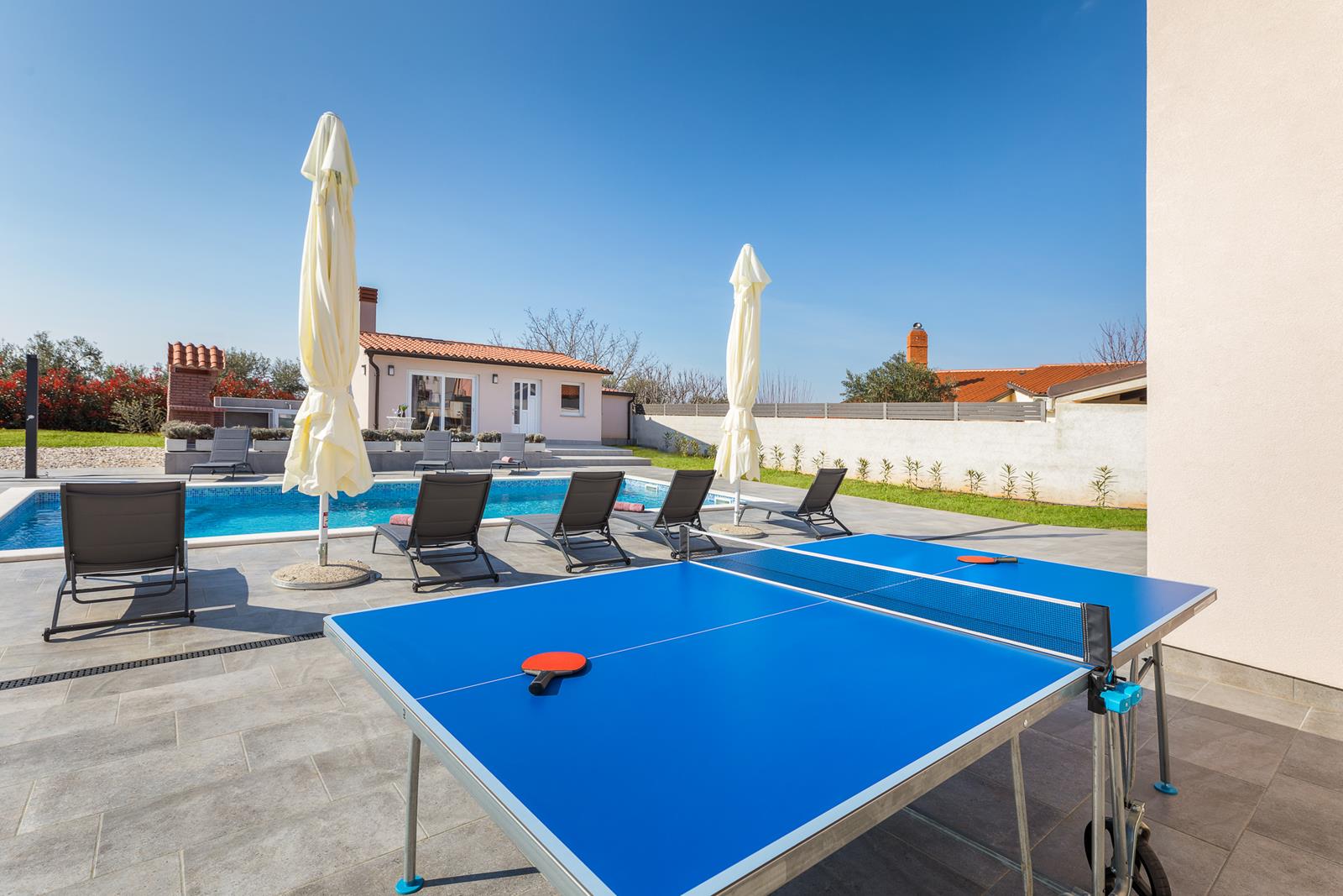 Vanjski prostor: zatvoreni vrt, privatni bazen 47m2, natkrivena vanjska terasa s vrtnom garniturom, 12 ležaljki i 3 suncobrana uz bazen, roštilj i vanjska kuhinja, vanjski tuš, privatni parking, stolni tenis, stolni nogomet i trampolin.