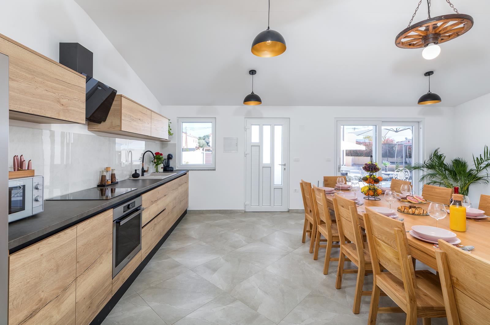 - potpuno opremljena kuhinja (4 ploče za kuhanje (indukcija), napa, hladnjak sa zamrzivačem, nespresso aparat za kavu, perilica posuđa, posuđe, kuhalo za vodu, toster, mikrovalna, pećnica )