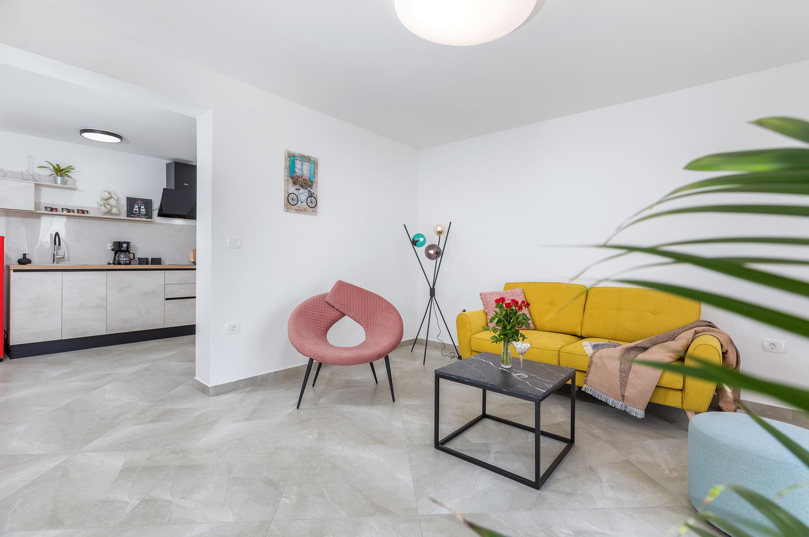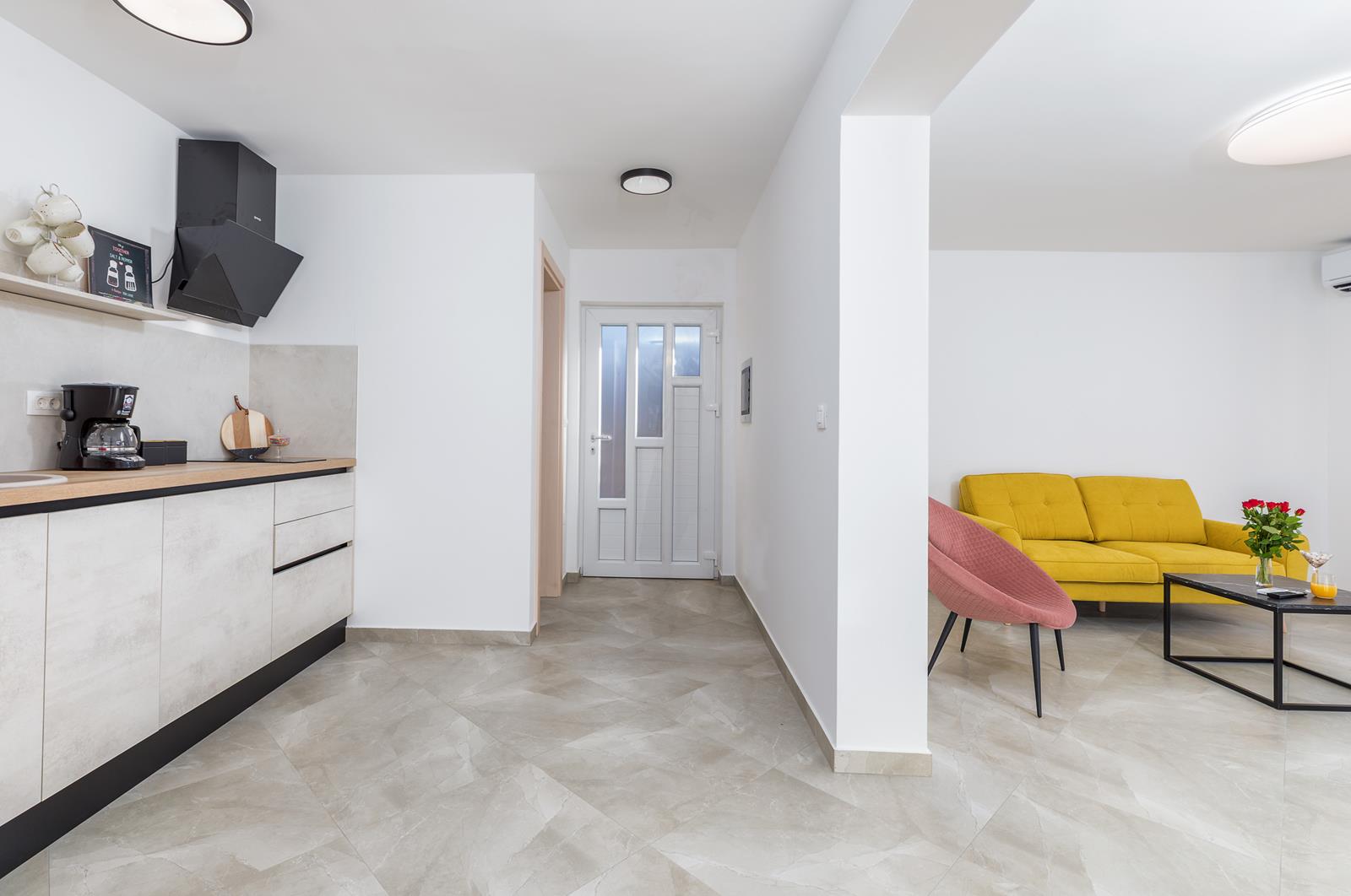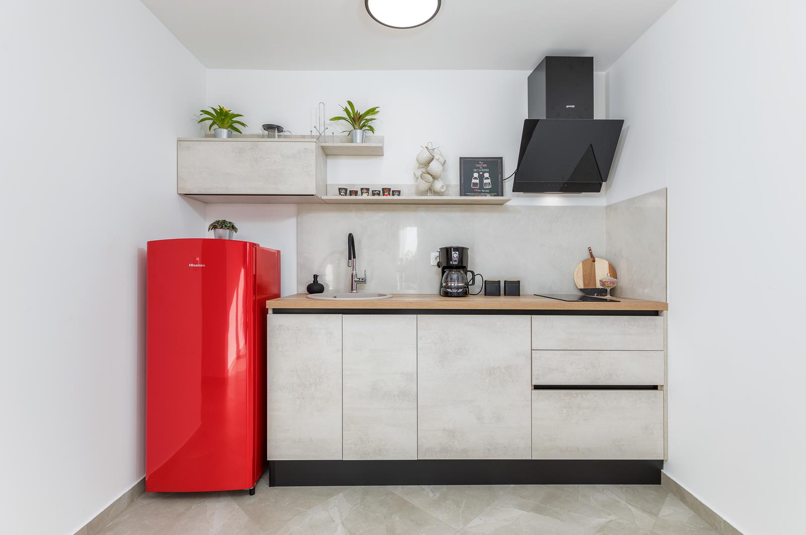 - kuhinja (oprema: 2 ploče za kuhanje (indukcija), napa, hladnjak sa dijelom za zamrzavanje, aparat za filter kavu, perilica posuđa, posuđe, kuhalo za vodu, toster)