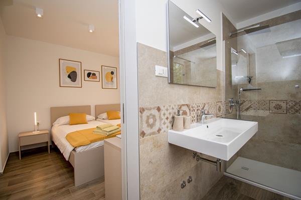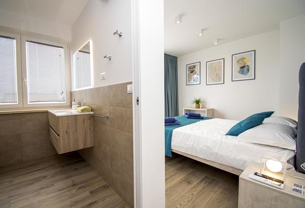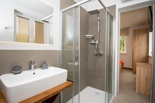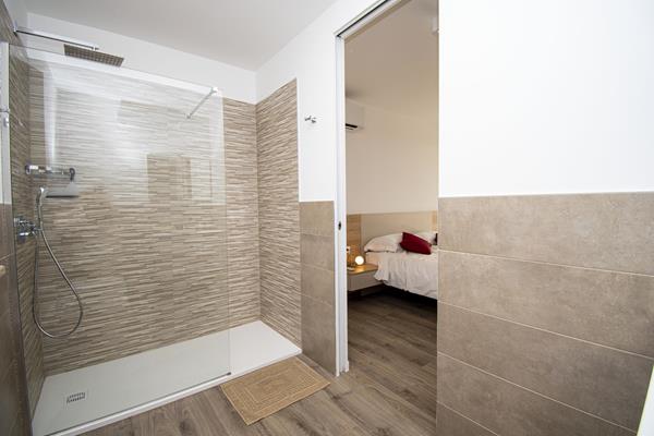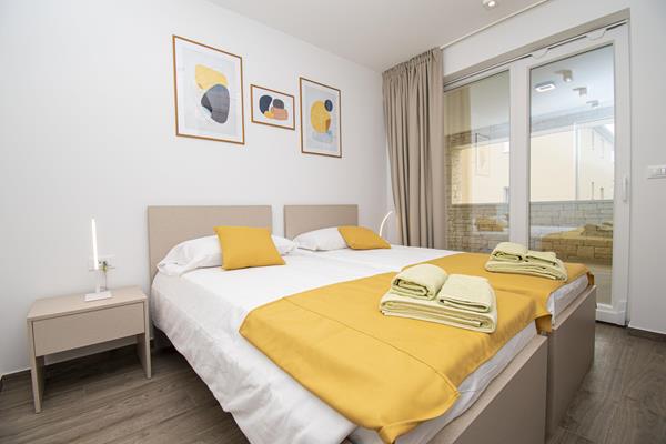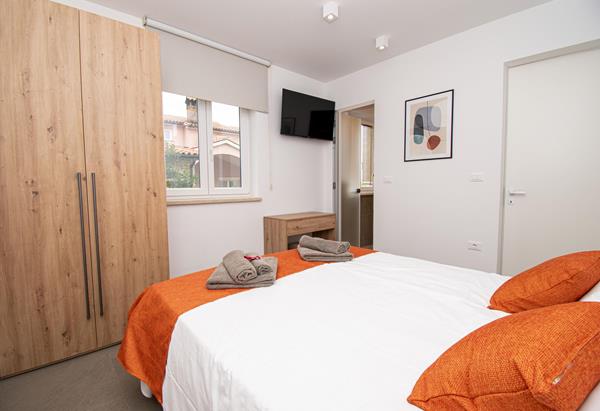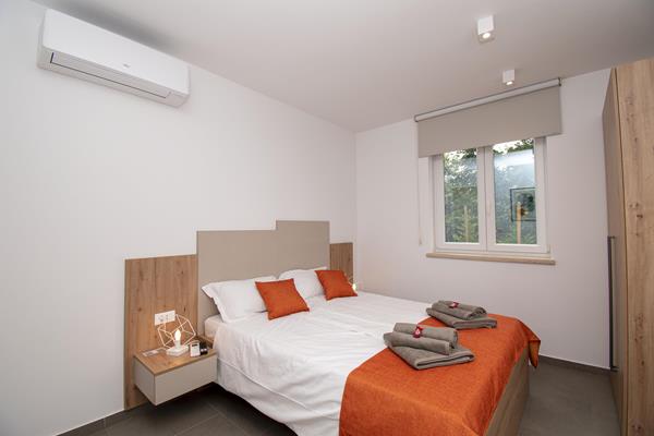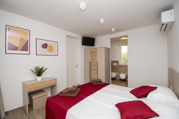 spavaća soba s bračnim krevetom (160 x 200 cm), klima-uređajem, SAT-TV-om, vlastitom kupaonicom (WC, bide, tuš, umivaonik, sušilo za kosu), izlaz na terasu