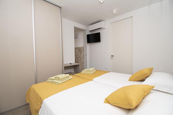 4. spavaća soba s dva odvojena kreveta (90 x 200 cm), klima-uređajem, vlastitom kupaonicom (WC, bide, tuš, umivaonik, sušilo za kosu), SAT-TV-om, izlazom na balkon