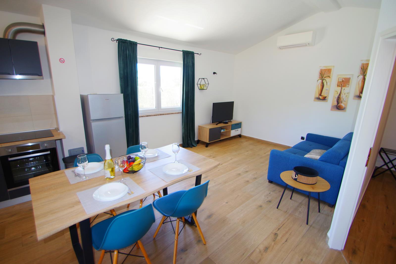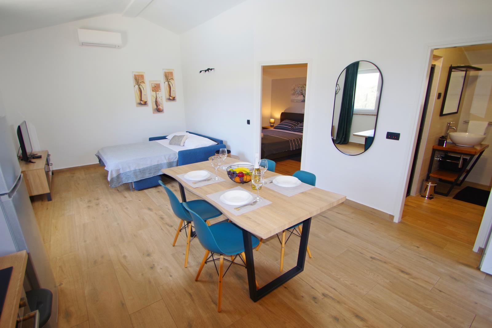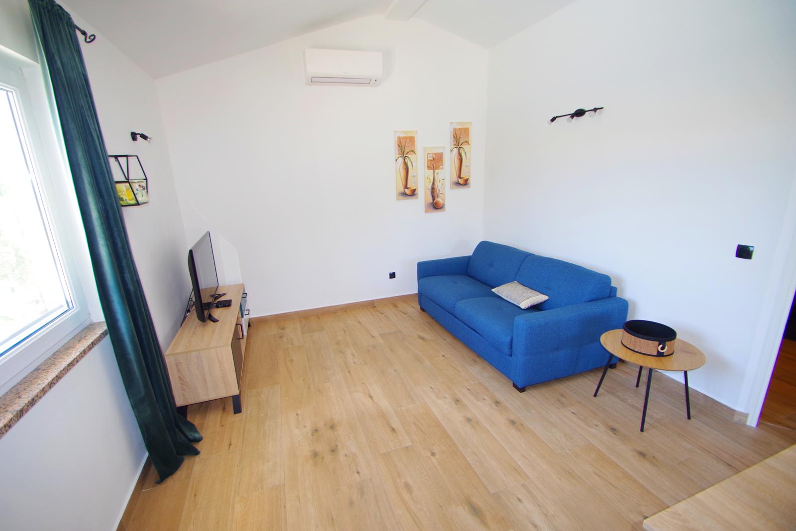 dnevni boravak s klima uređajem, TV-om (EON TV), sofom (ležaj na razvlačenje za 2 osobe), blagovaonica