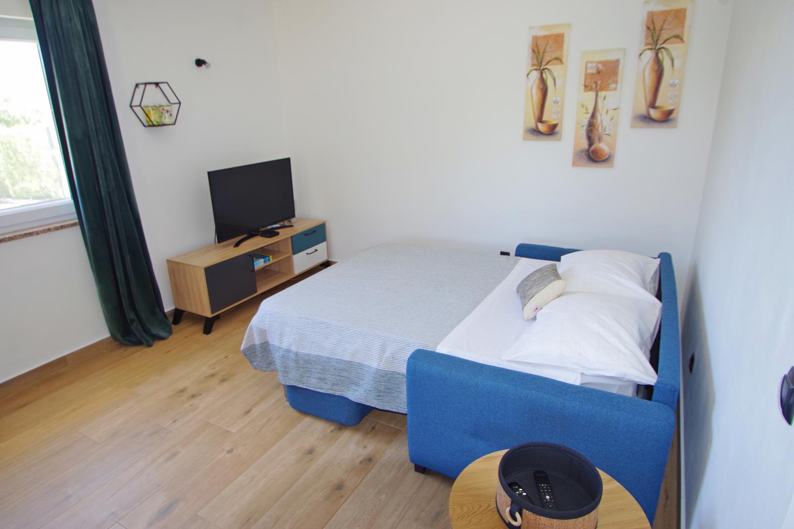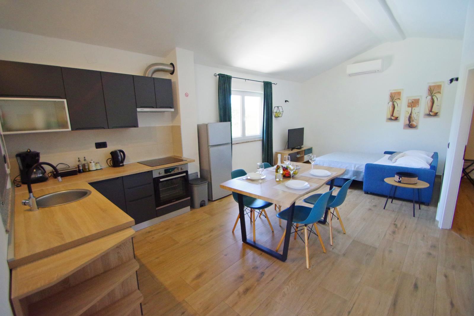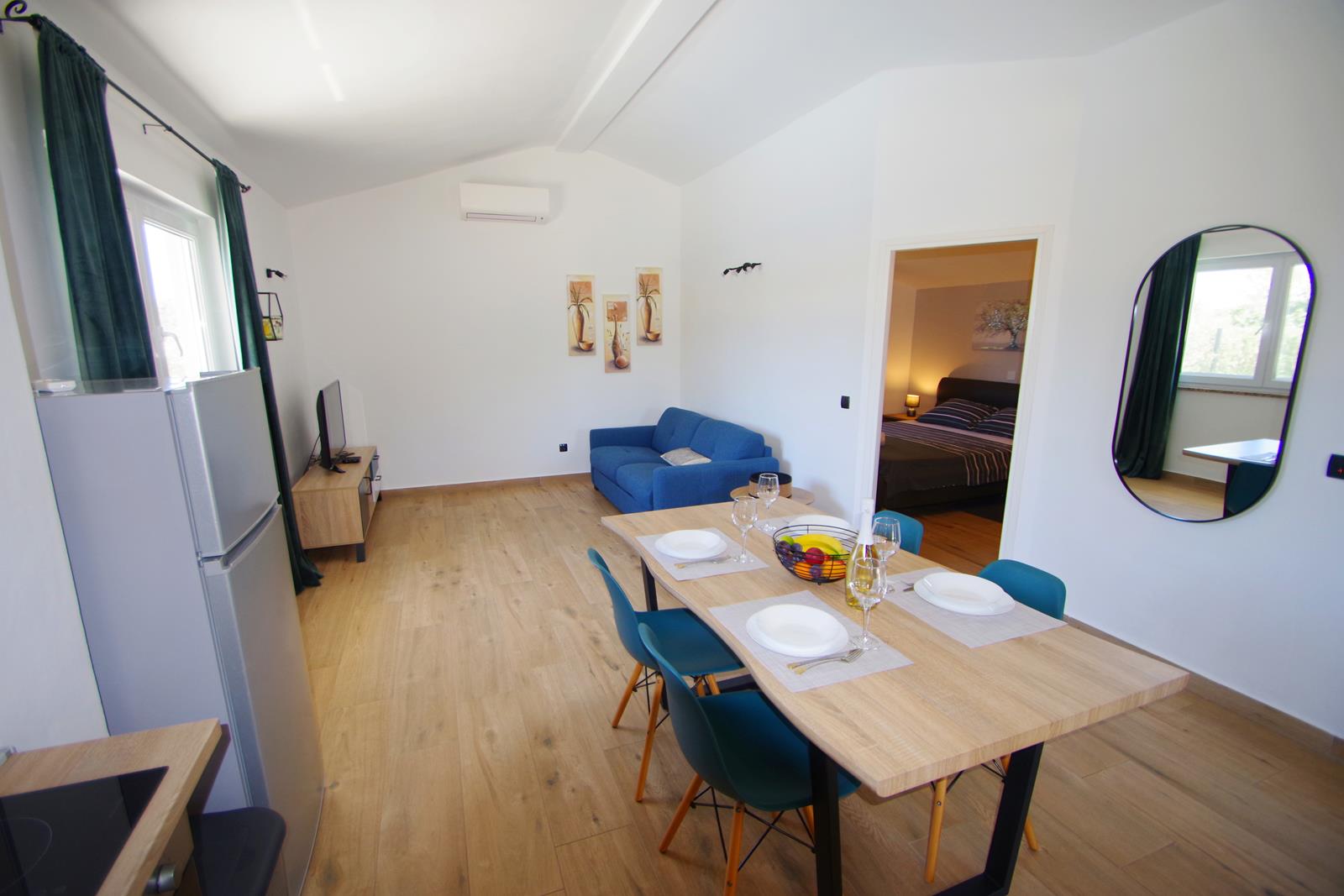 dnevni boravak s klima uređajem, TV-om (EON TV), sofom (ležaj na razvlačenje za 2 osobe), blagovaonica