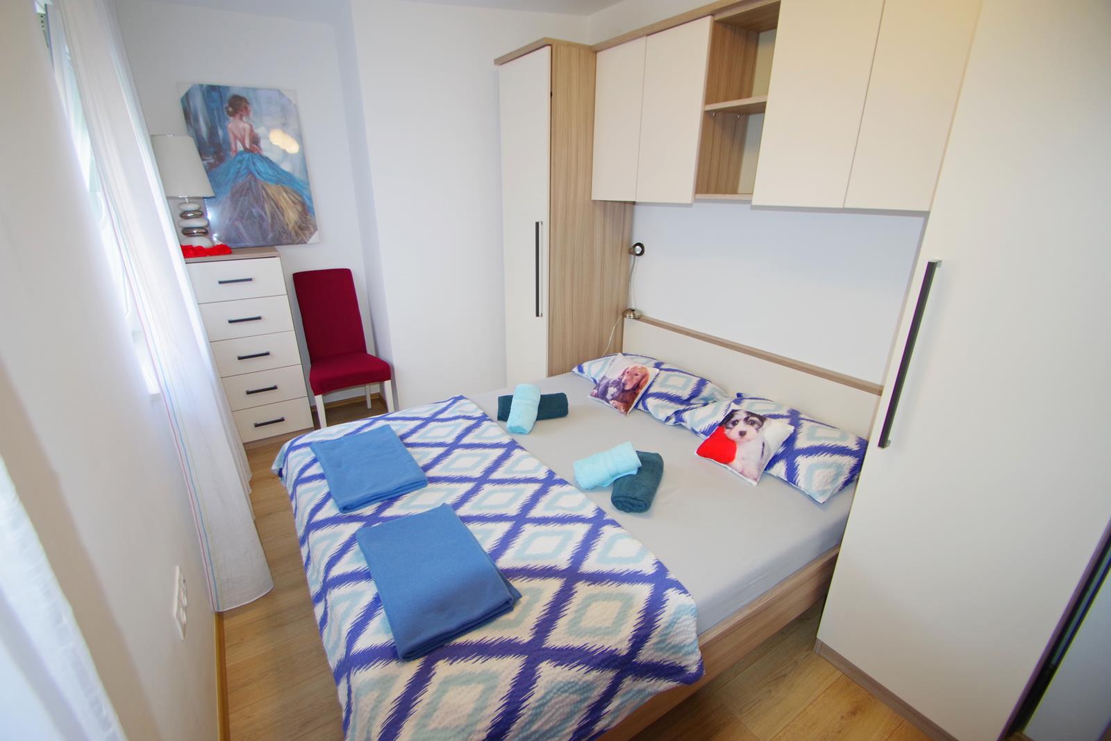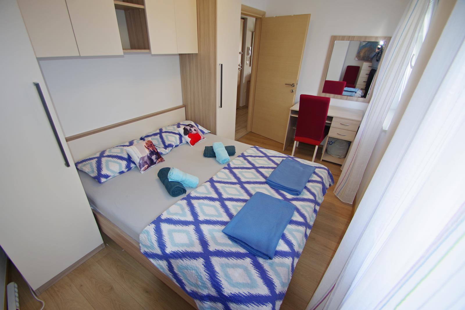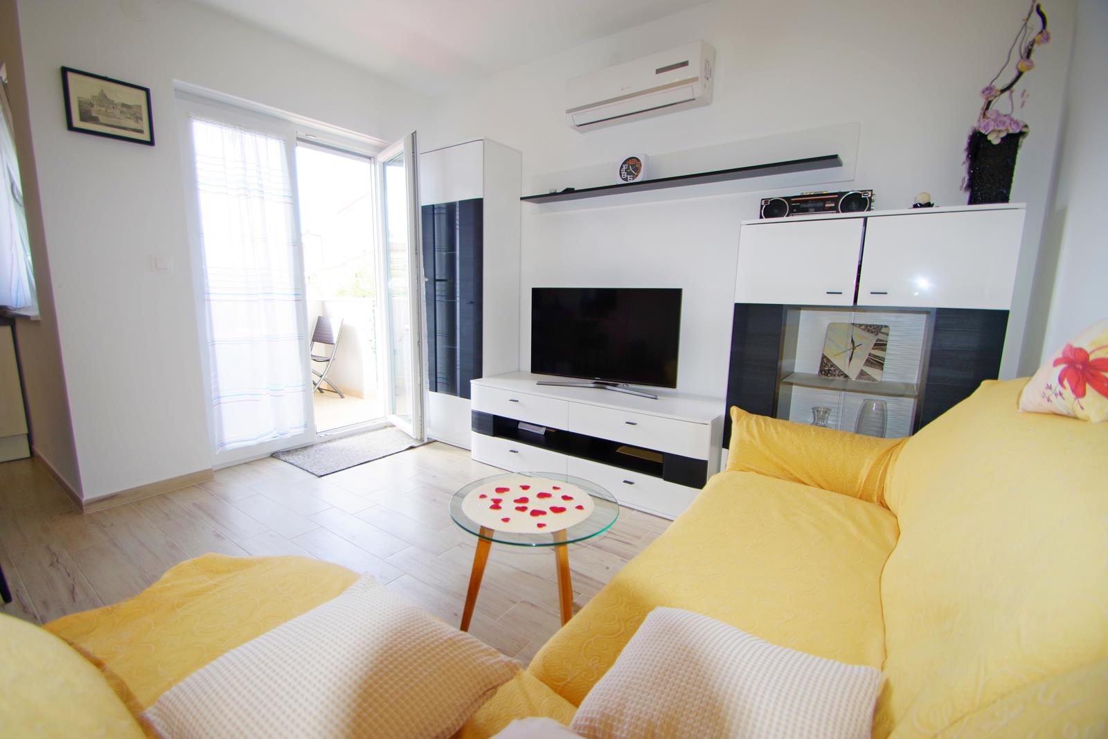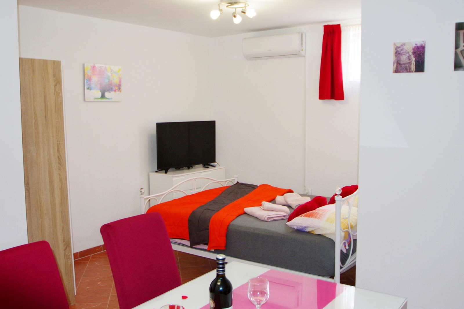 - bračnog kreveta (160 x 200 cm) u dnevnom prostoru, s TV-om i klima uređajem
