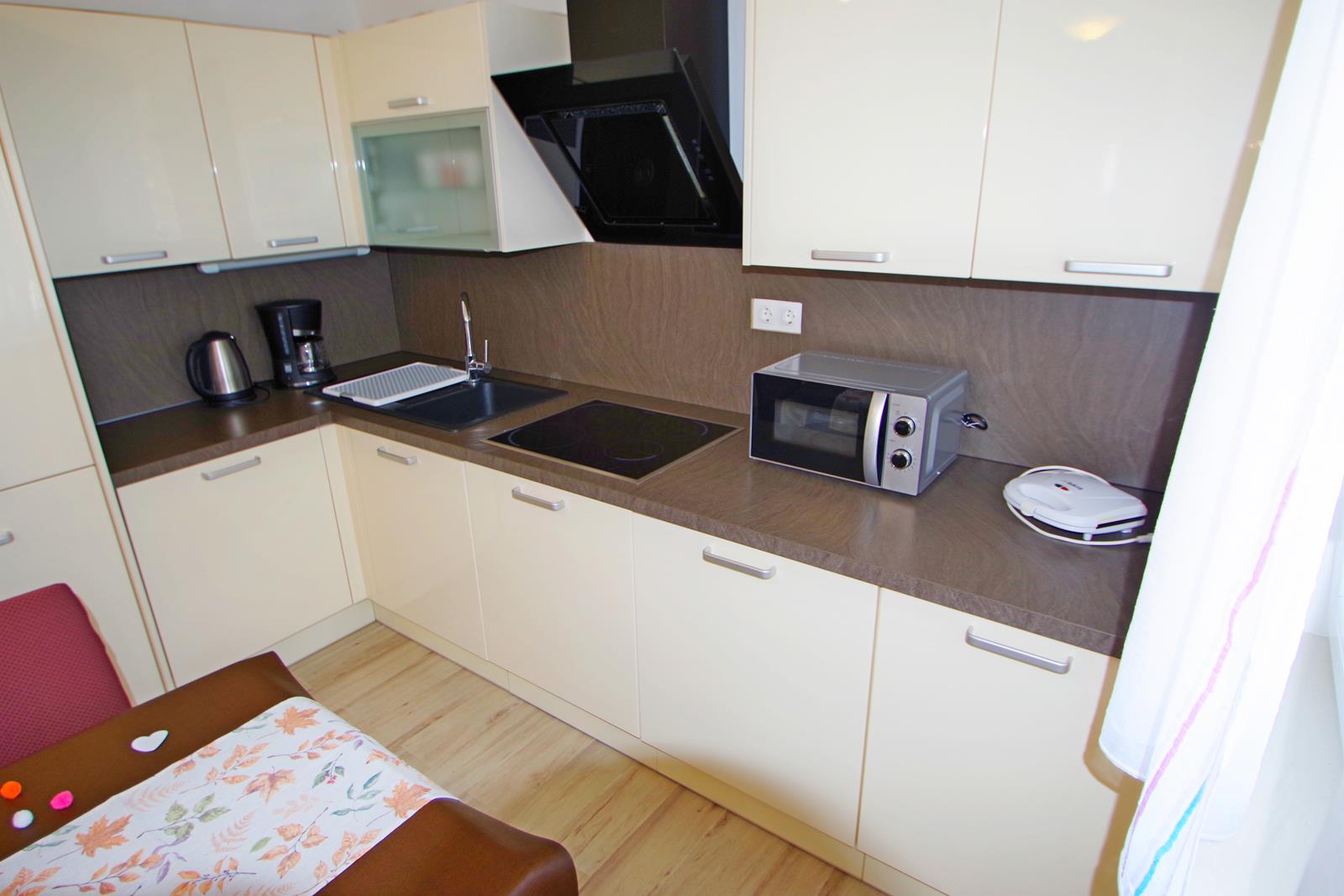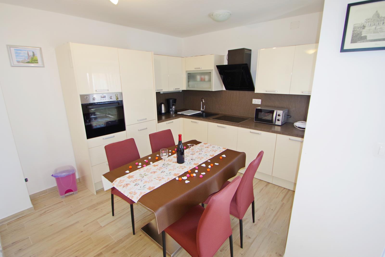 - kuhinje s: 4 električna kuhališta, aparatima za kavu (filter i Moka), hladnjakom sa zamrzivačem, kuhalom za vodu, pećnicom, napom i tosterom