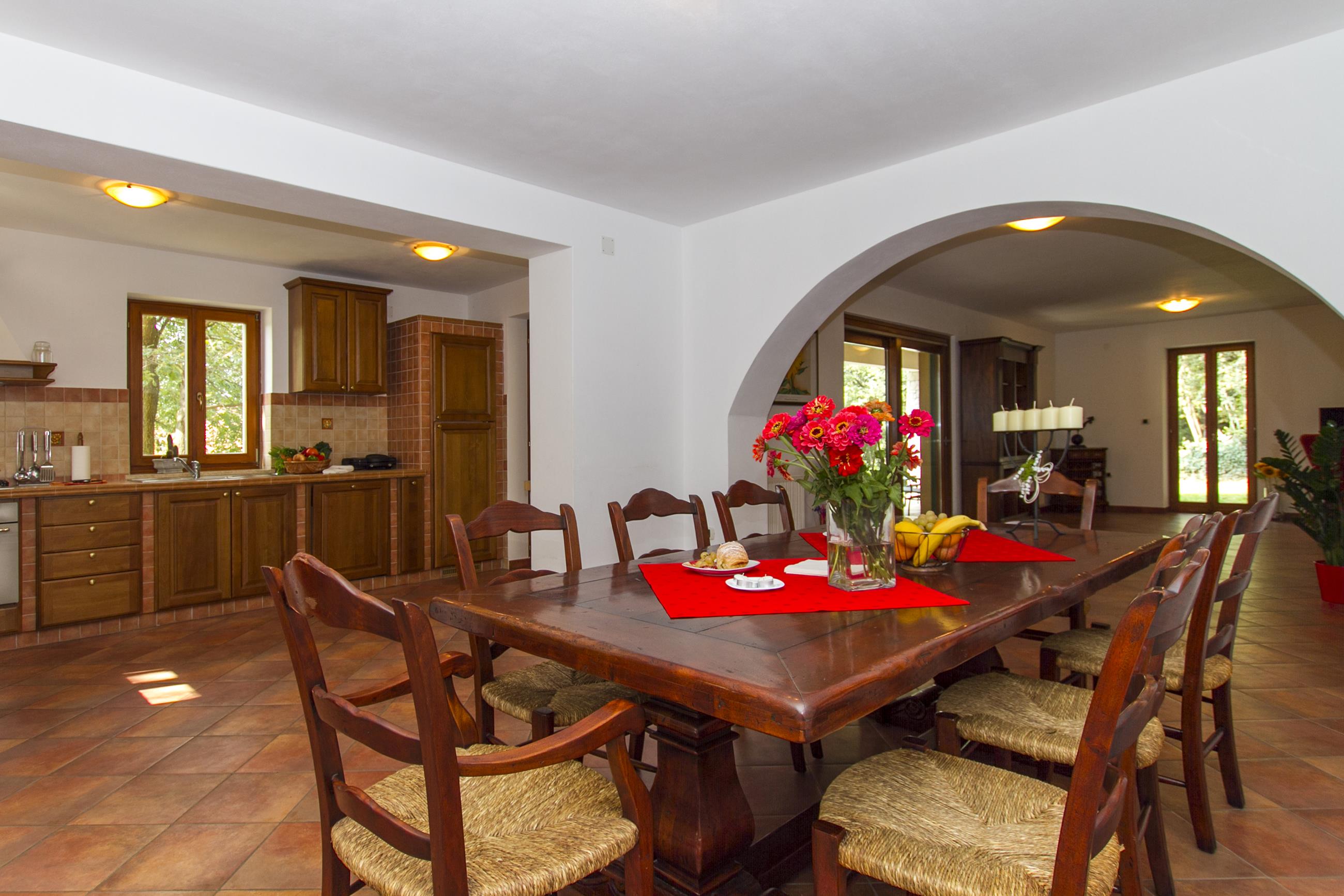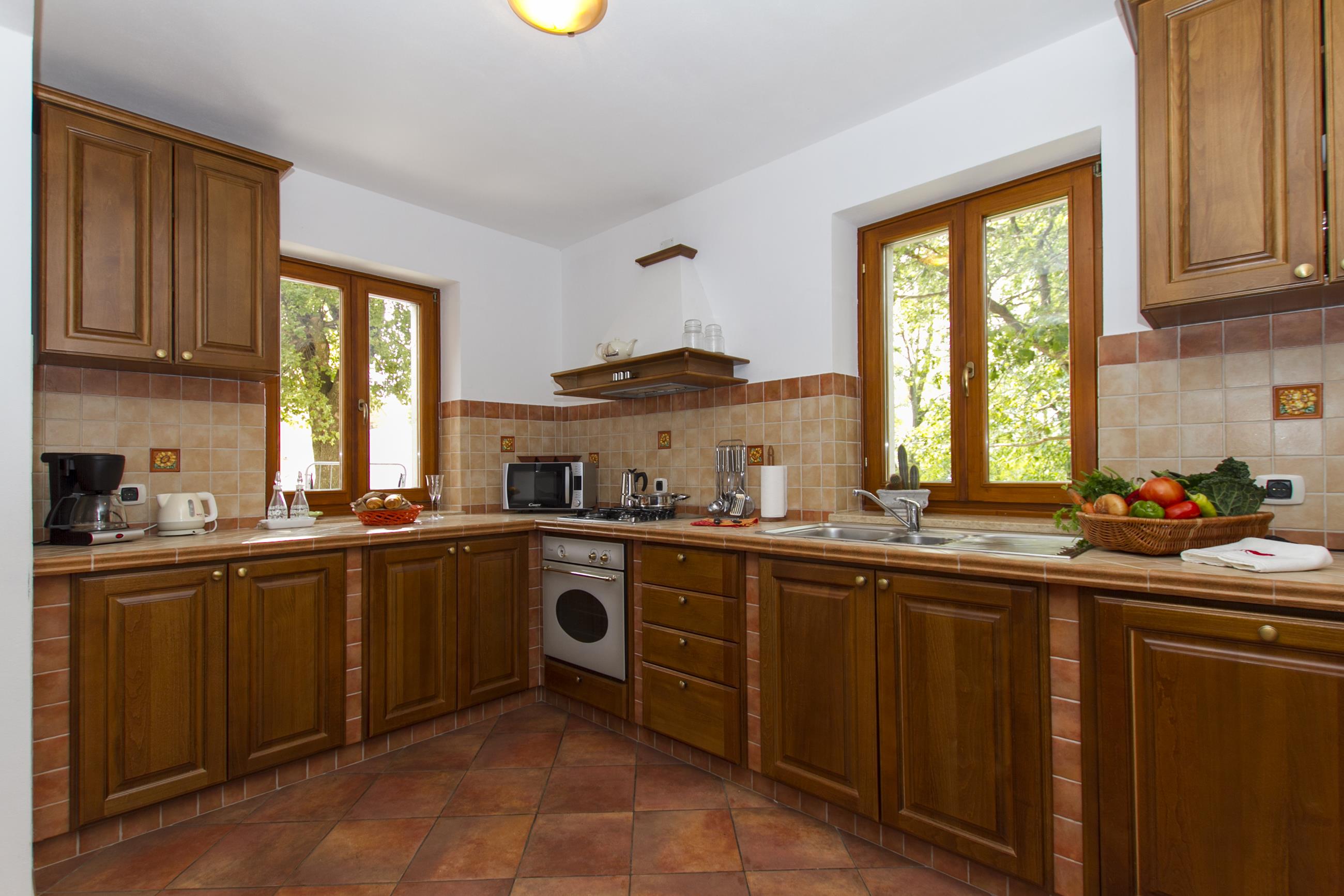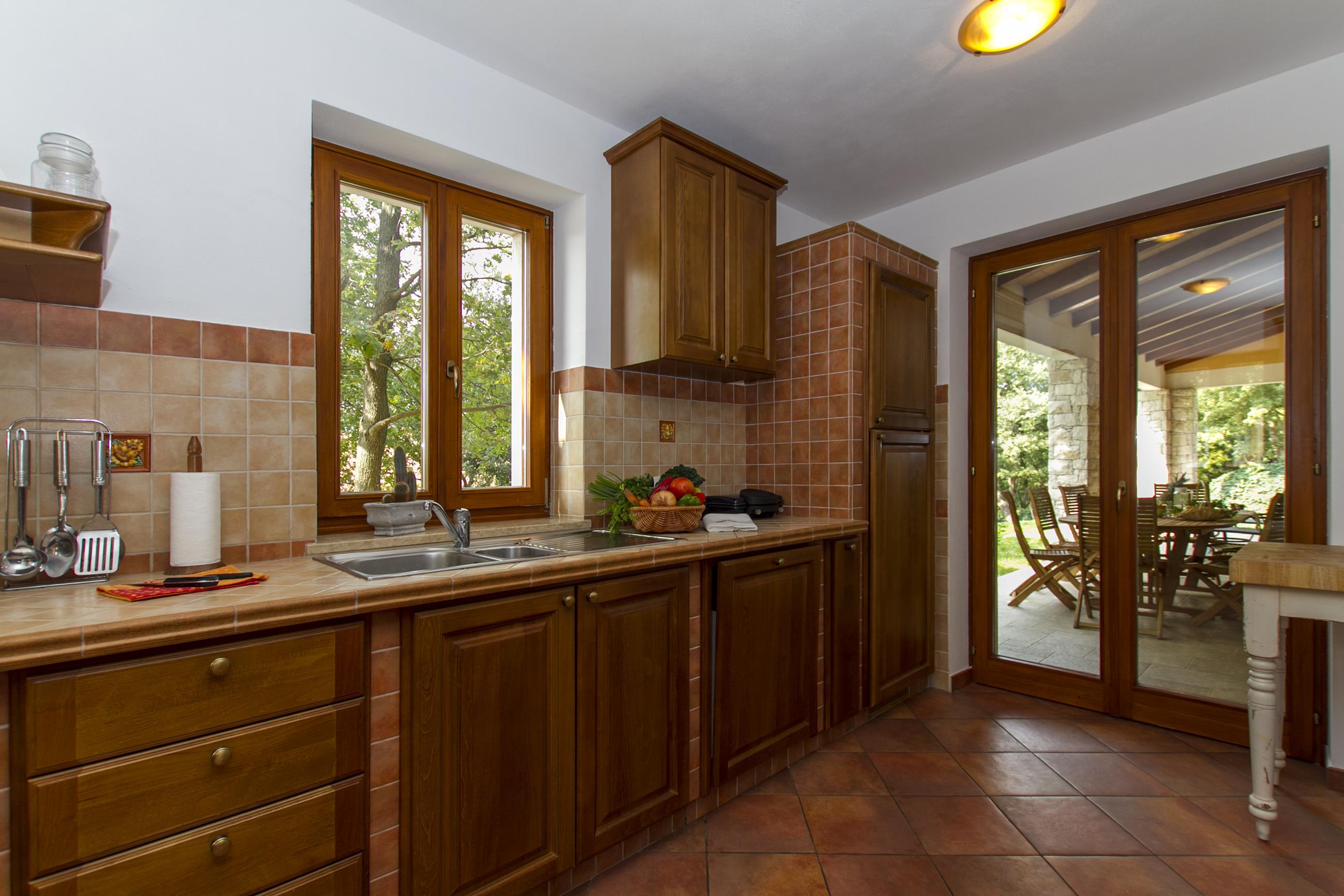 Oprema kuhinje: štednjak s 4 ploče za kuhanje (3 plinske + 1 električna), hladnjak sa zamrzivačem, perilica posuđa, kuhalo za vodu, aparat za kavu (filter), pećnica, mikrovalna pećnica, toster, napa, posuđe za kuhanje i jelo