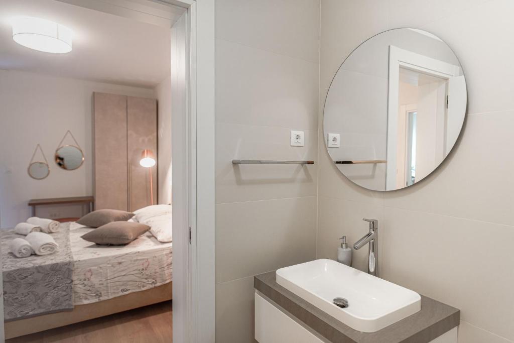spavaća soba s francuskim krevetom (140 x 200 cm); vlastita kupaonica (tuš, WC, umivaonik, sušilo za kosu), klima uređaj