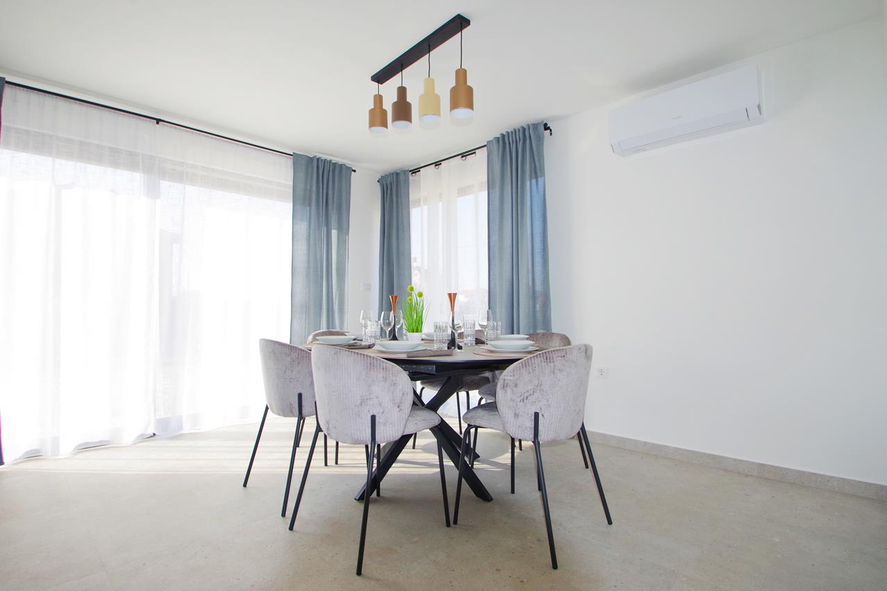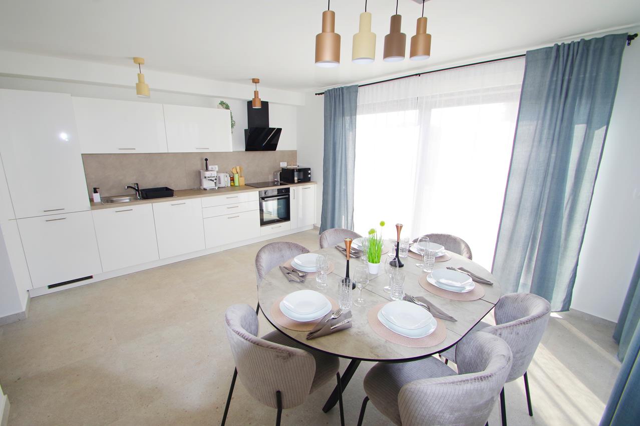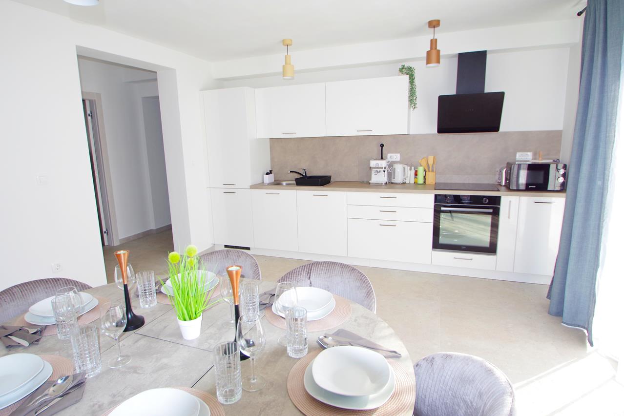 - Potpuno opremljena kuhinja sa štednjakom s 4 električne ploče za kuhanje, aparatom za espresso kavu, kuhalom za vodu, hladnjakom s odjeljkom za zamrzavanje, mikrovalnom pećnicom, pećnicom, perilicom posuđa, napom, tosterom i blagovaonskim stolom
