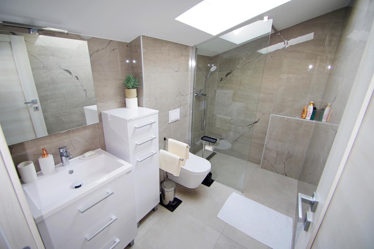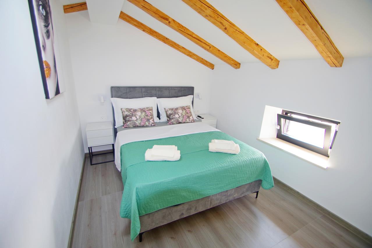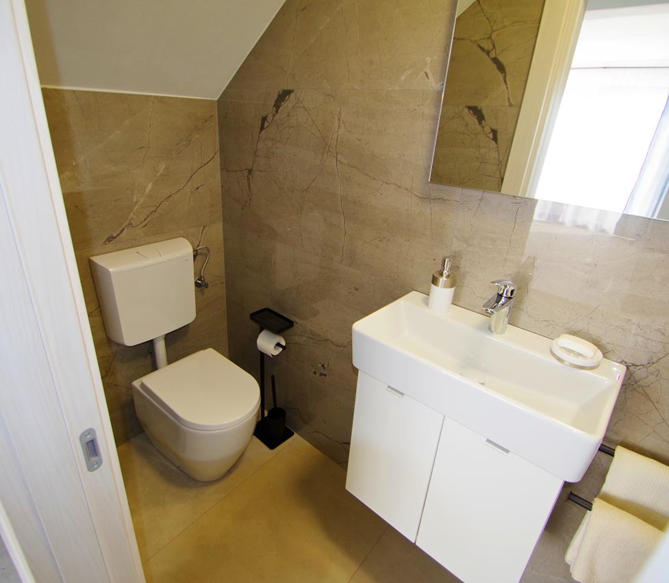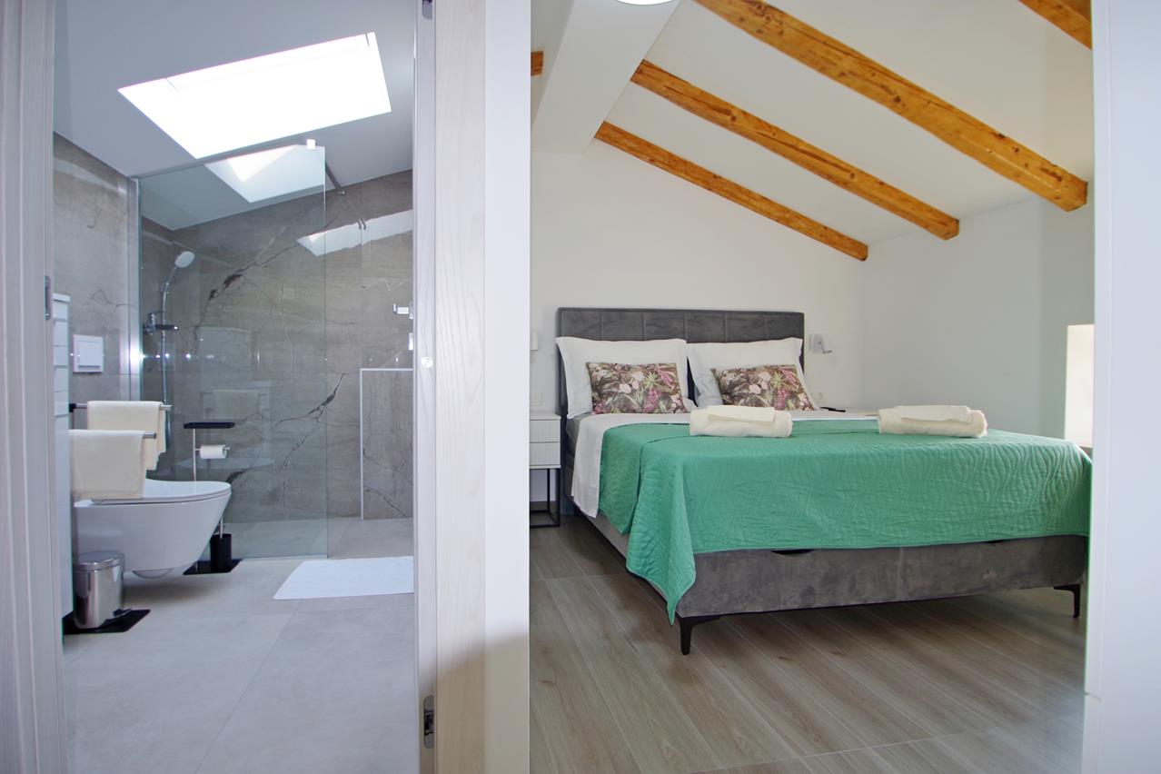 - Spavaća soba s bračnim krevetom (160 cm x 200 cm), klima uređajem, SAT TV-om i vlastitom kupaonicom (tuš, umivaonik, sušilo za kosu, WC); niski strop